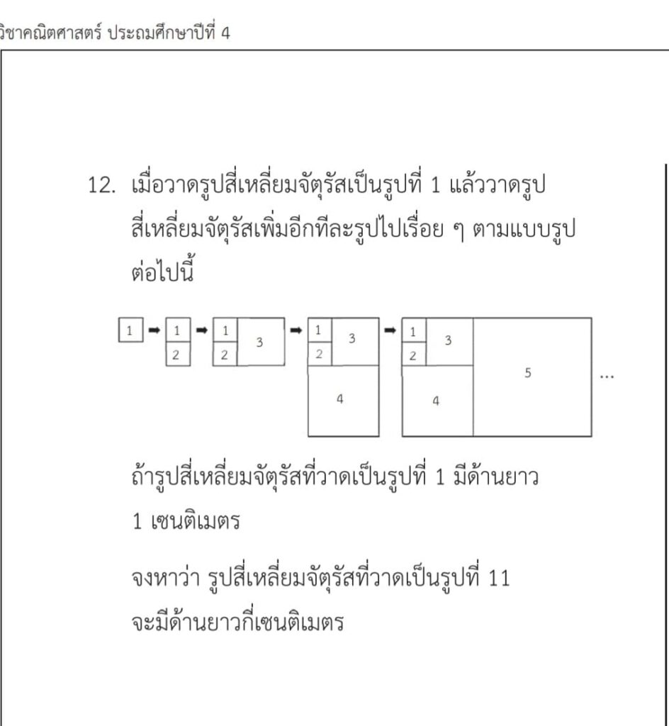 หลานอยู่ป.4 เอาข้อสอบเลข tedet มาให้ดู เธอบอกอ่านเฉลยแล้วยังงงๆ โจทย์ถามความยาวด้านของสี่เหลี่ยมรูปที่ 11 (โจทย์ตามรูป 1) และเฉลย (ตามรูป 2)
