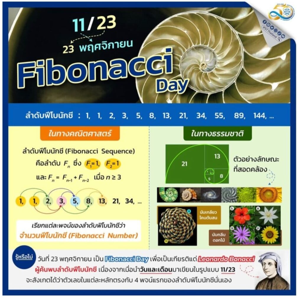 ลำดับฟิโบนักซี (Fibonacci sequence) คือ จำนวนลำดับที่ 3 ขึ้นไป เกิดจากสองจำนวนที่มาก่อนบวกรวมกัน ดังนี้ ลำดับ 1, 1, 2, 3, 5, 8, 13… จำนวนถัดไปในลำดับ คือ 21 ซึ่งจะคำนวณได้โดยนำ 8 บวกด้วย 13 ได้ 21 เด็กๆจะได้เห็นตัวเลขชุดนี้บ่อย ตั้งแต่ข้อสอบระดับประถม